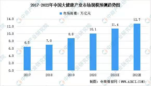 第四, 市场规模预测:我国大健康产业市场规模由2017年6.5万亿元增至2020年10.1亿万元,年均复合增长率达15.83%,预计2022年我国大健康产业市场规模将达12.7万亿元。